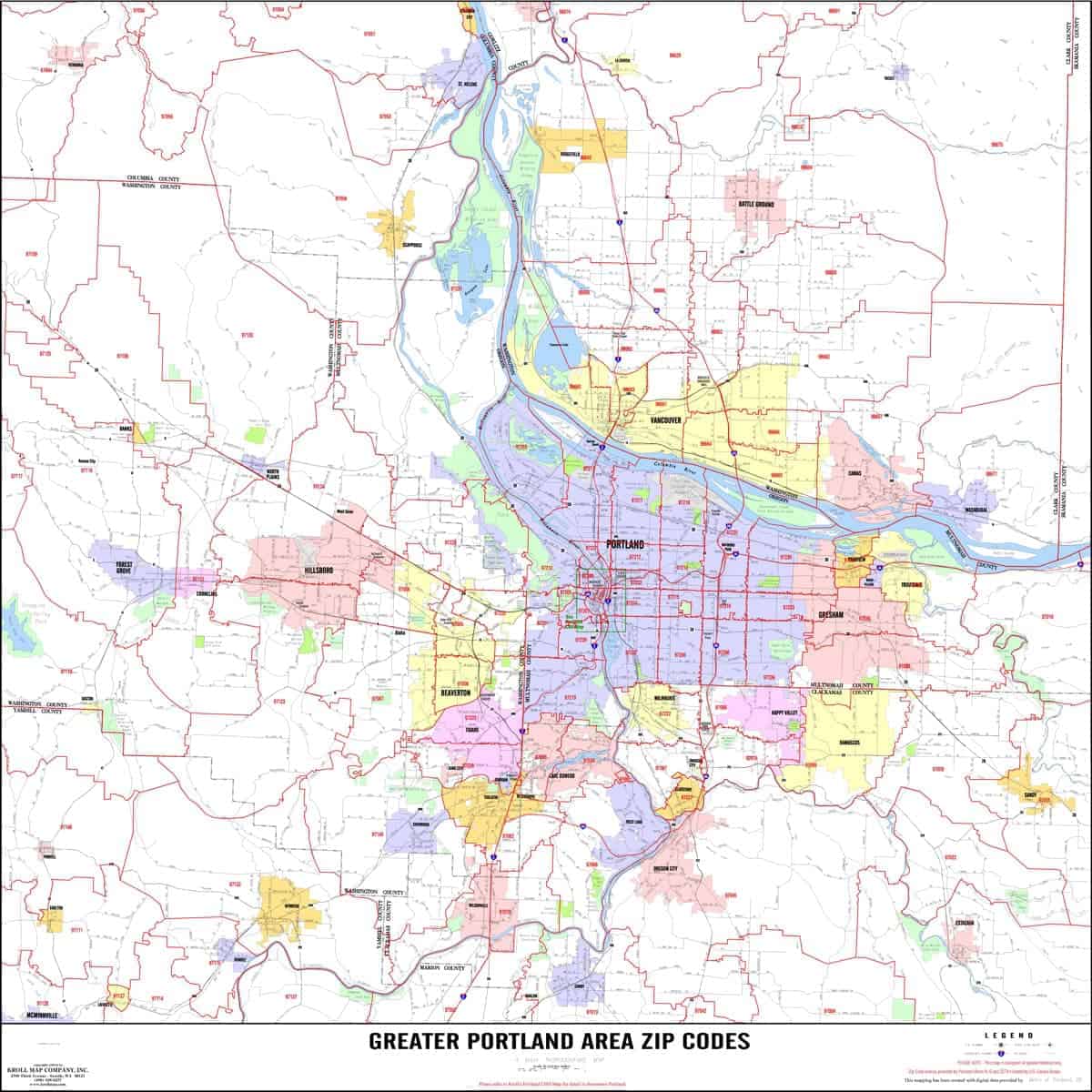 Kroll’s Portland Area arterial maps show major arterials and just the right amount of detail for most commercial uses. This level of mapping depicts neighborhood names, city names, major commercial and government features. ZIPcodes available at no extra charge.